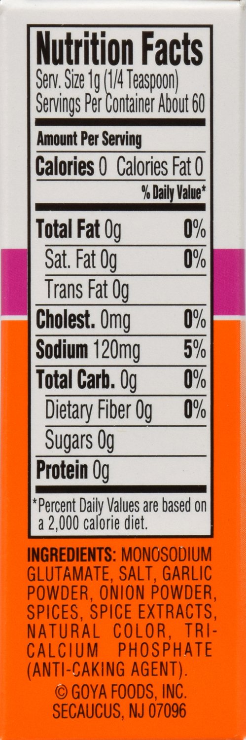 - A UNIQUE SEASONING Inside this box, you'll find the secret to creating the authentic flavors of Latino Cuisine. Packing a powerful punch of Garlic, Salt, Onion and Spices, this small packet of Sazón GOYA instantly makes your dish more delicious by quickly adding an appealing flavor