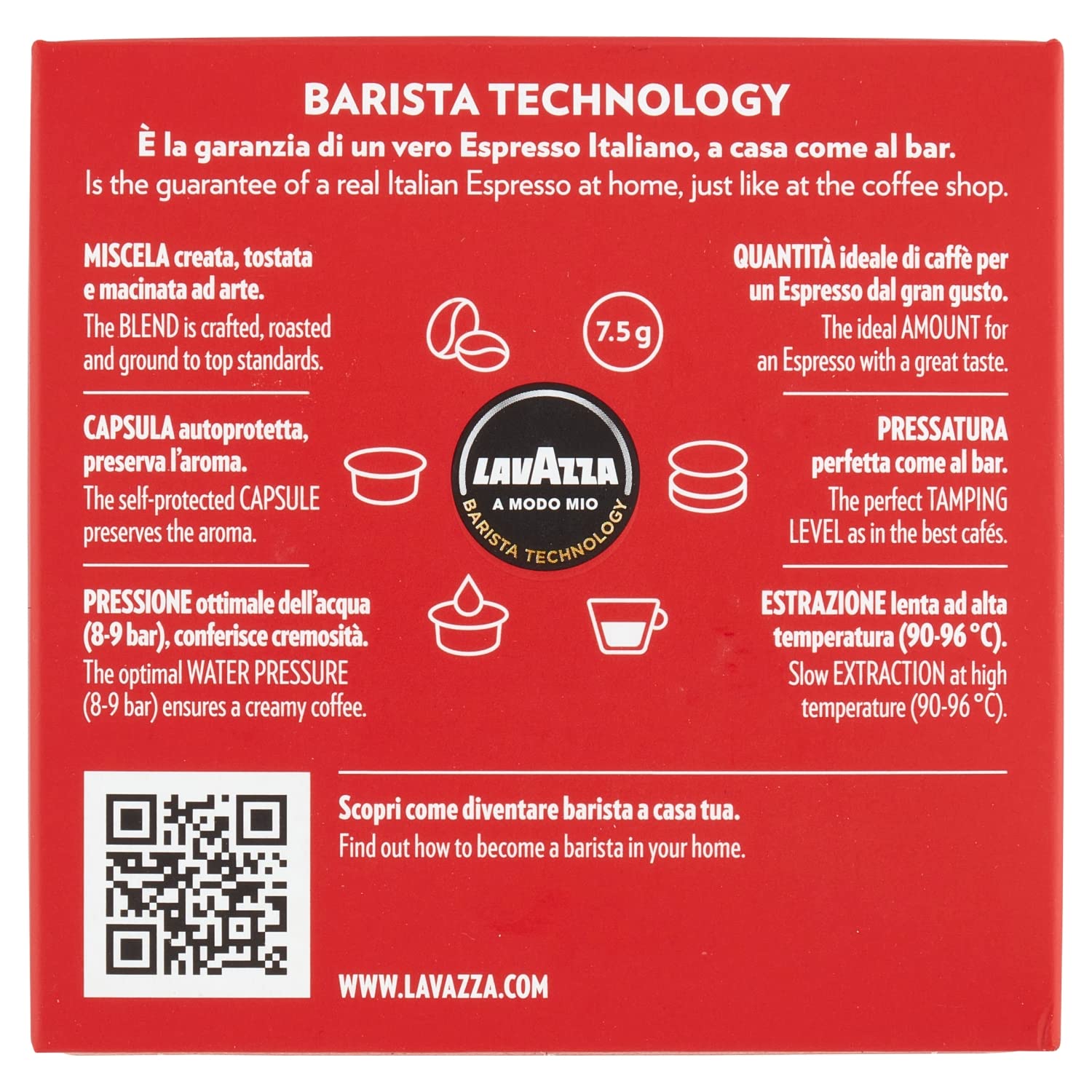 Finally the traditional blends of Lavazza in a capsule, for those who desire to indulge in the aroma, intensity and creamy consistency of a perfect espresso coffee. We have been committed to achieving excellence in the production of coffee since 1895. We can count on a solid experience, accumulated over four generations of passion for our work and care of our products. Our entire history has been marked by a series of innovations, beginning with concept of blend, invented by Lavazza at the turn of the 20th century. Today Lavazza is the symbol of Italian coffee throughout the world, one of the main expressions of our lifestyle and values of our country. Full-bodied and persistent flavour, Well-balanced, 10 intensity, Medium roast, The Italian coffee shop at home