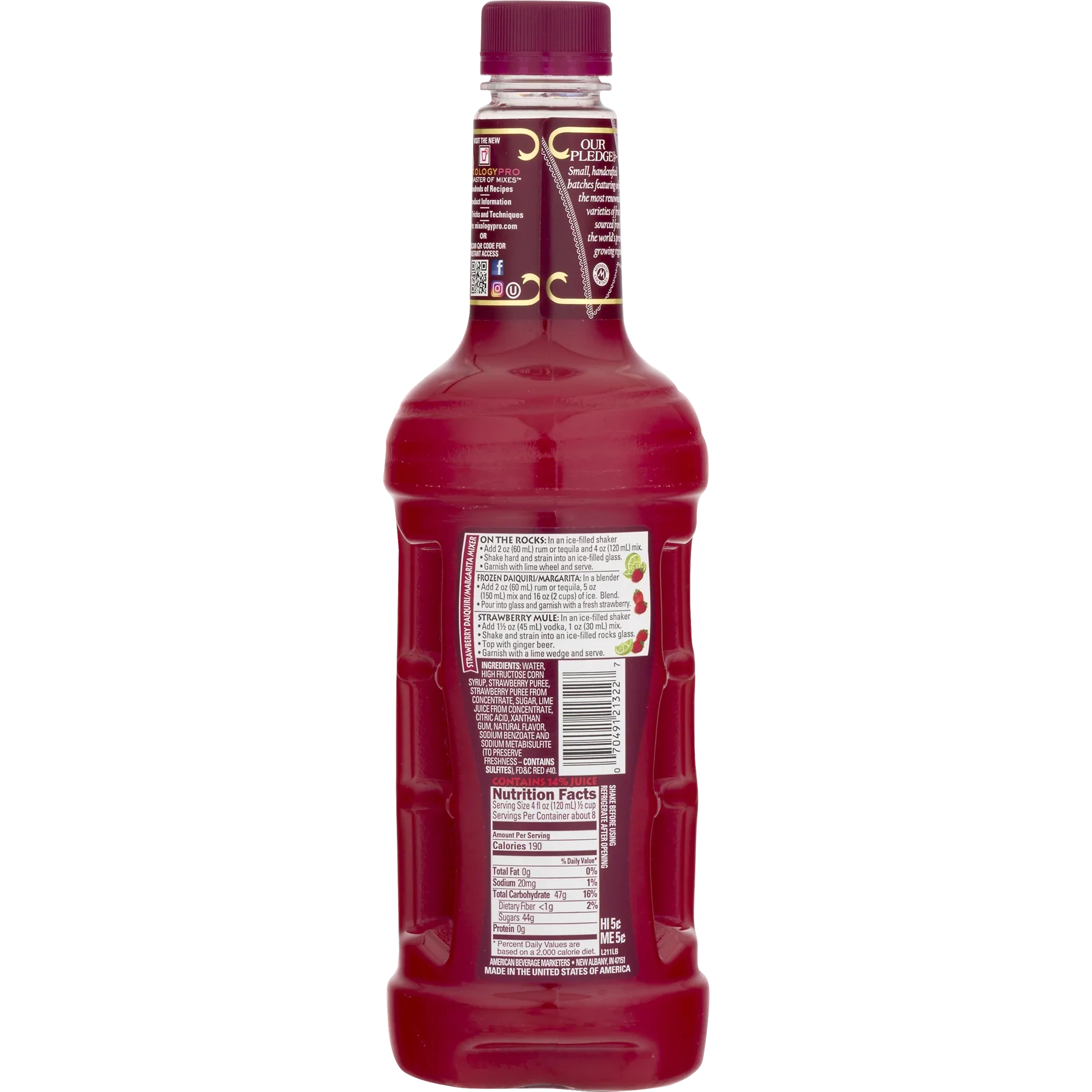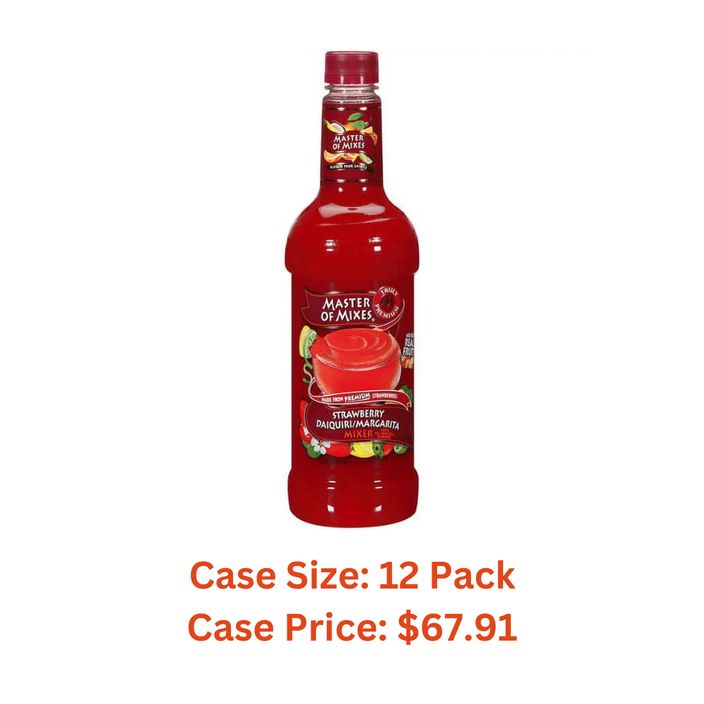 Master of Mixes Strawberry Daiquiri/Margarita Mixer Ready To Use, 1 Liter Plastic Bottle, Shelf-Stable. This Master of Mixes Strawberry Daiquiri Margarita Mix is made from premium strawberries and key lime juice to elevate your spirits. It's expertly blended with ingredients that make it versatile enough to be used in both on the rocks and frozen applications. This strawberry cocktail mix makes an ideal addition to your drink mixing needs for any party or gathering as you and your guests will be sure to enjoy. It is easy to use and gives a delicious taste with all natural flavors made from premium strawberries.